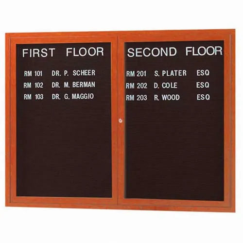 Aarco Outdoor Enclosed Letter Board 2 Door 48"W x 36"H Oak Wood-Look Finish Aluminum Frame Outdoor Enclosed Oak Wood Look Aluminum Frame Directory Boards has a unique powder coated process that combines the rich appearance of natural hardwood with the rugged and enduring qualities of extruded aluminum. Units are made of custom extruded parts engineered to provide accurate, durable and handsome cabinets. The unit is vented for moisture reduction and the rear panel is weatherized All corners are neatly mitered and assembled with heavy duty reinforcements and fasteners. Lockable doors are mounted with a full length piano hinge and feature acrylic safety glass windows and a thick rubber door seal. The fixed rear panel is a vinyl cover letter board designed to accommodate changeable letters with tabs spaced on 1/4" centers. Concealed mounting brackets are provided. 48"Wx36"H This is a 2 door unit OADCO3648R