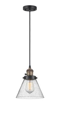 This 1 light Mini Pendant from the Franklin Restoration Cone collection by Innovations Lighting will enhance your home with a perfect mix of form and function. The features include a Black Antique Brass finish applied by experts. Product Features Include: Brand: Innovations Lighting, Collection: Franklin Restoration Cone, SKU: 201CSW-BAB-G44, UPC: 745684612919, Category: Mini Pendant, Finish: Black Antique Brass, Glass: Seedy Large Cone, Material: Steel/Cast Brass/Glass, Designer: Bruno Marashlian, Width: 8.00 in., Height: 10.00 in., Max Height: 131.25 in., Diameter: 8.00 in., Backplate/Canopy Width: 4.50 in., Backplate/Canopy Length: 0.00 in., Backplate/Canopy Thickness: 0.75 in., Weight: 2.75 lb., Included Chain/Rods/Cord: 10 Feet Of Black Textured Cord, Switch: On/Off Turn Switch, Warranty: 2 Year Finish, Lifetime Electrical, Bulbs Included: No, Bulb Category: Incandescent, Primary Bulb(s): 1 x 60.00 watts Medium Base ST64 Vintage, Color Temperature: 2200K, Color Rendering Index: 99.9000, Total Lumens: 220, Voltage: 120, Safety Rating: UL/ETL Damp