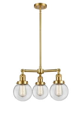 INNOVATIONS LIGHTING 207-SG-G202-6-LED Beacon 3 Light Chandelier part of the Franklin Restoration Collection. The Beacon 3 Light Chandelier is part of the Franklin Restoration Collection. Includes 1-6 and 2-12 inch Stems With Solid Brass 90 Degree Hang Straight Swivel for Sloped Ceilings. Solid Brass 90 Degree Hang Straight Swivel for Sloped Ceilings Included. Collection: Franklin Restoration. Material: Steel, Cast Brass, Glass. Metal Finish(Body): Satin Gold. Metal Finish(Canopy/Backplate): Satin Gold. Dimension(in): 19(W) x 11(H). Minimum Height (Fixture Height with Shade, Cord or Included Stems & Canopy)(in): 20.875. Max Height (Fixture Height with Cord or Included Stems & Canopy)(in): 44.875. Bulb: (3)3.5 Watt LED Vintage Medium Base Bulb Included,Dimmable. Color Temperature: 2700. Color Rendering Index(CRI): 82. Lumens): 350. Voltage: 120. Glass: Clear Beacon/Transparent. Shade Shape: Globe. Shade Material: Glass. Shade Size(in): 6 X 5.75. Shade Fitter Measurement: 3.25 inch Fitter. Canopy Dimension(in): 4.5 x 0.75. Includes 10 Feet of Wire. Solid Brass 90 Degree Hang Straight Swivel for Sloped Ceilings Included. UL/CUL Damp Rated. Warranty: 2 Year Finish, Lifetime Electrical.