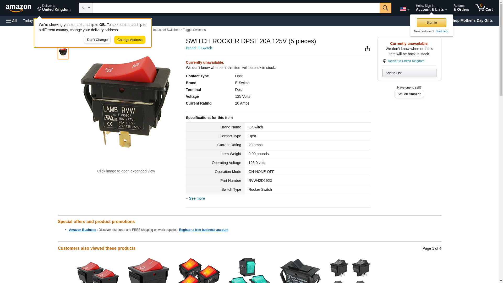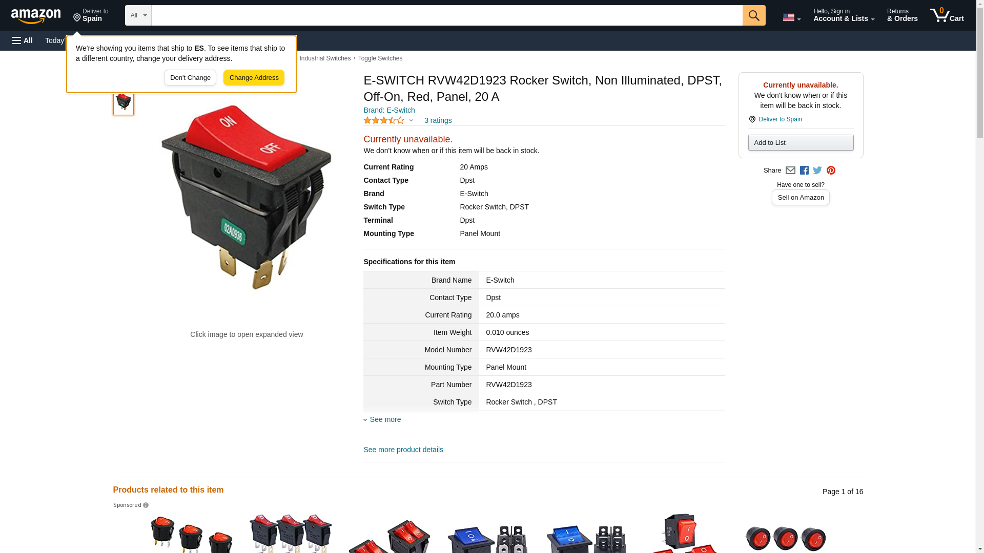 E-SWITCH RVW42D1923 Rocker Switch, Non Illuminated, DPST, Off-On, Red, Panel, 20 A