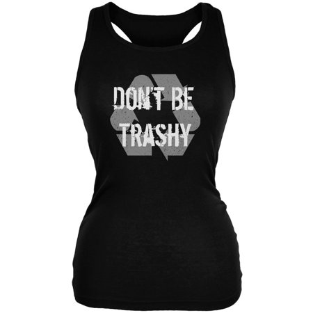 Are you a recycling king or queen? Then spread the love & awareness with this Old Glory original direct-to-garment design black,100% cotton soft juniors tank top features splatter text saying "Don't be Trashy" with a distressed recycling symbol tucked behind it.Show off your love of mother earth.