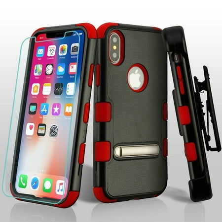 iPhone X Holster Case Protector Combo, by Insten Hard Hybrid Plastic TPU Cover Case w/stand/Holster/Installed For Apple iPhone X - Red/Black (Bundle with Clear Nano-Tech Plastic Screen Protector)