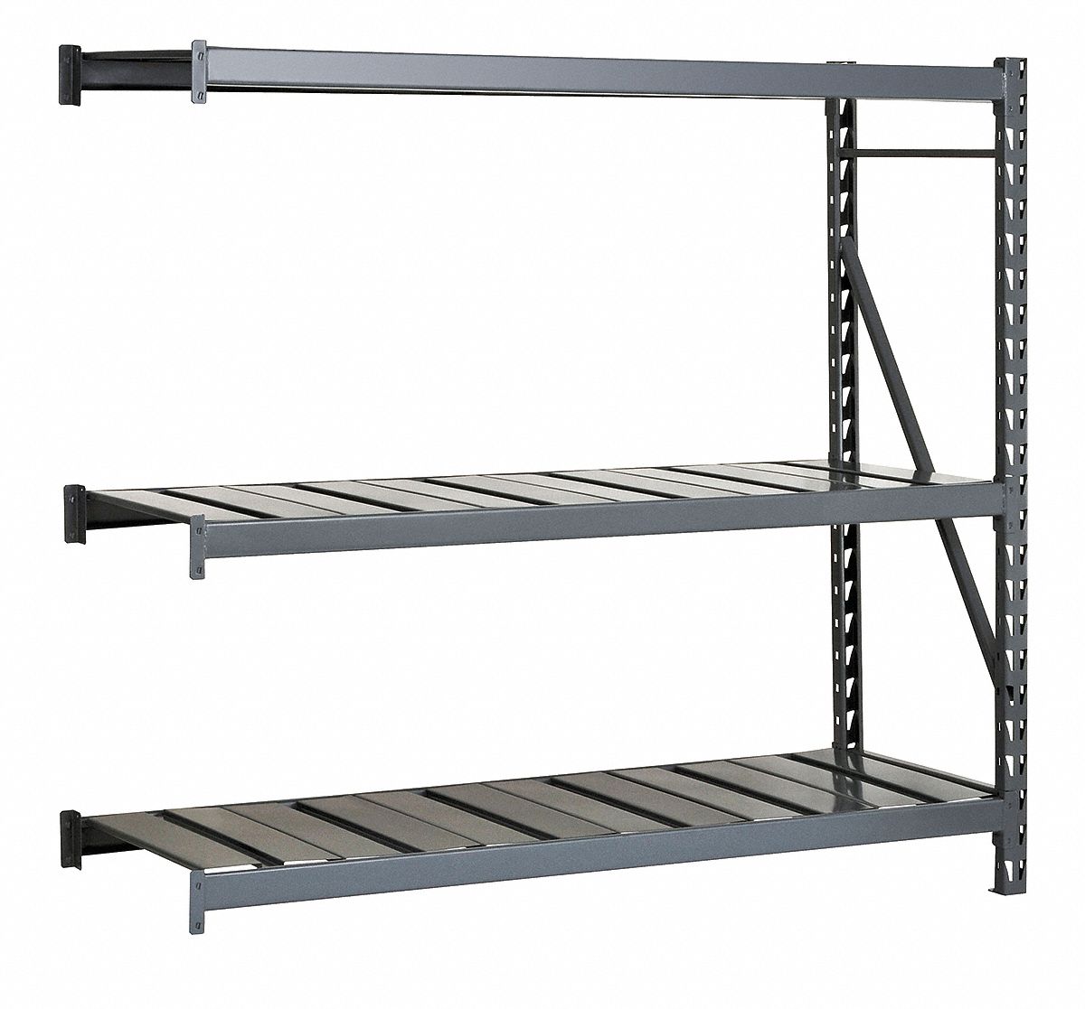 Bulk Storage Rack Width 48 In. Depth 24 In. Height 96 In. Load Capacity 11 400 lb. Number of Shelves 3 Capacity per Shelf 3800 lb. Beam Capacity 3800 lb. Gray Material Steel Decking Material Ribbed Steel Finish Powder Coated Adjustable Increments 3 In. Includes (1) Upright Frame and (3) Shelf Levels