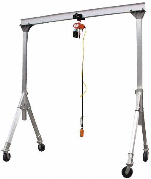 ALUMINUM GANTRY CRANES Ideal for use in multiple or remote locations. These units are unaffected by weather and/or wet conditions. Provides safe, one-person lifting of heavy equipment in a variety of work-sites. It's lightweight design enables for quick assembly and knockdown. The welded aluminum cranes have adjustable I-beams for an infinite number of span settings, plus 2 adjustable height uprights. Polyurethane-on steel include 4 position swivel locks for secure placement. Remember to order a hoist and trolley Order Now!!