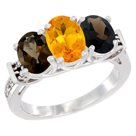 14K White Gold Natural Citrine & Smoky Topaz Sides Ring 3-Stone Oval Diamond Accent, sizes 5 - 10