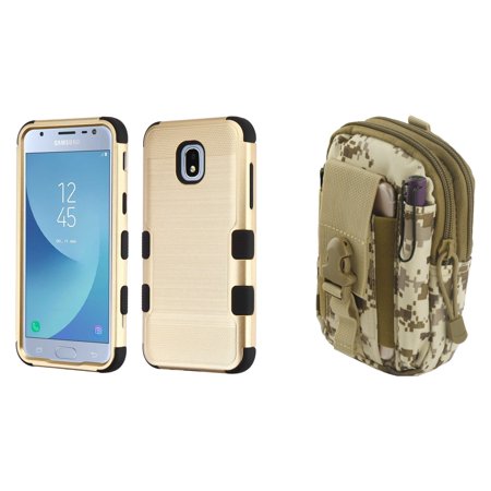 TUFF Hybrid Military Grade Metallic Brushed Slate Finish Phone Protector Case (Gold/Black) with Desert Camo Tactical EDC MOLLE Waist Bag Holder Pouch and Atom Cloth for Samsung Galaxy Amp Prime 3