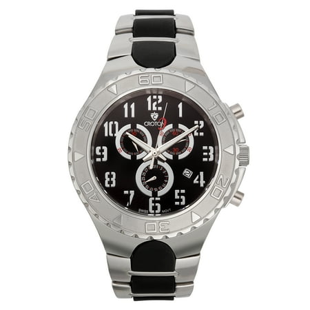 Make a statement with this 48mm Swiss Chronograph. All stainless steel and a stainless steel & silicon tapered bracelet. When you stand this watch up you get to see how the case flows flawlessly into the bracelet and how the high polished numbers on the satin finished rotating bezel pick up the light from the stainless steel bracelet. The numbers from the bezel bring out the Silvertone Arabic numbers on the dial as well as the Silvertone sub dials with their red highlights. The 48mm case has a domed Sphereulite crystal and a Swiss ISA 8171 Chronograph movement inside. The tapered 26mm stainless steel and silicon bracelet opens and closes easily with the deployment clasp with push buttons. The watch is water resistant to 165' - 5 ATM and comes with a Limited Lifetime Warranty.<p>Country of Origin: USA or Imported