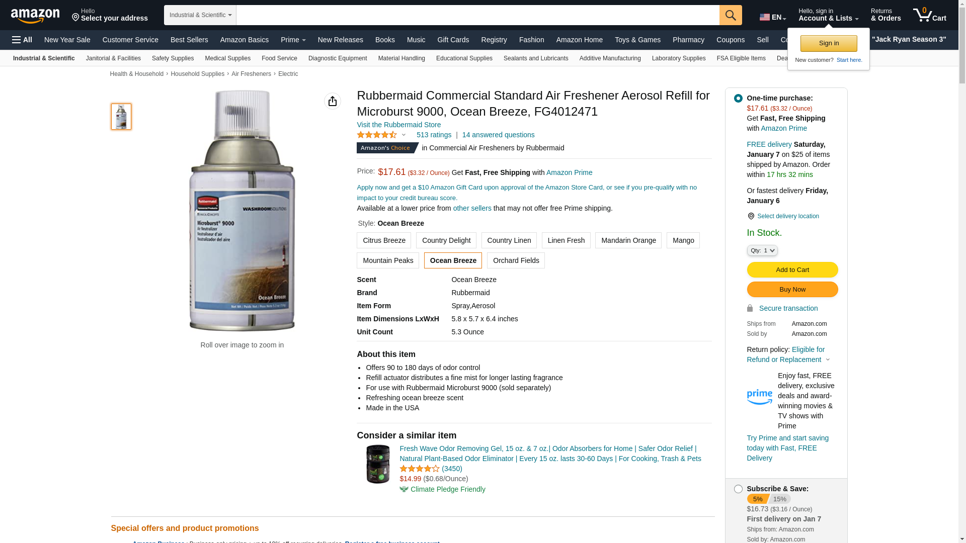 Rubbermaid Commercial Standard Air Freshener Aerosol Refill for Microburst 9000, Ocean Breeze, FG4012471