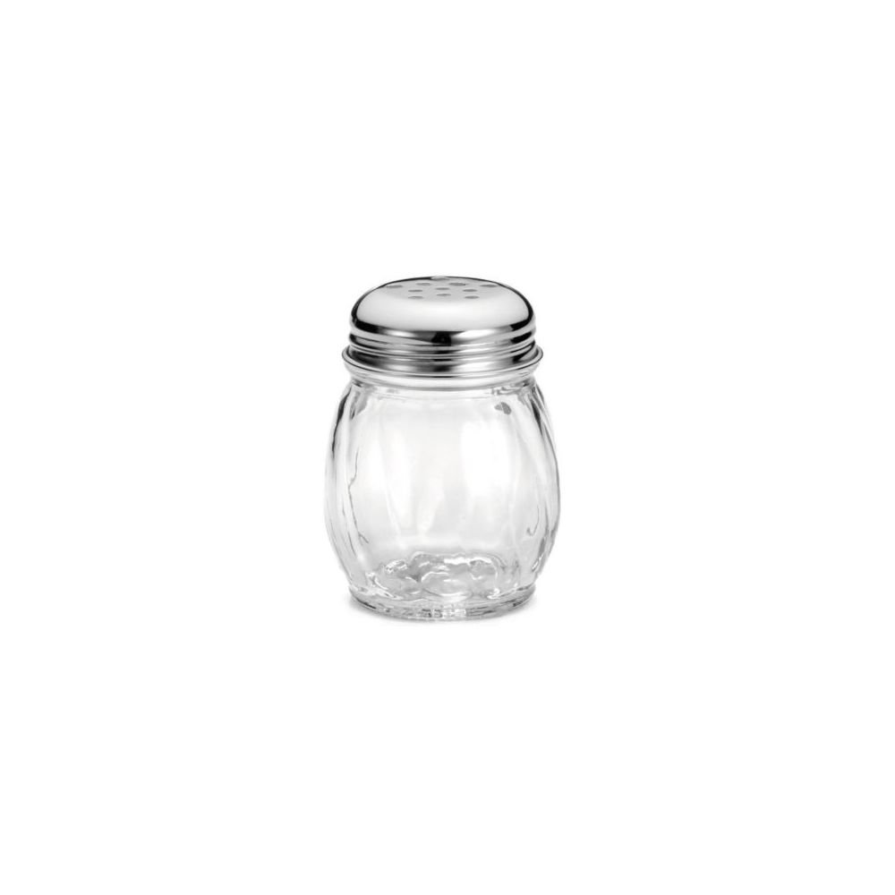 Tablecraft Swirl Glass 6 Oz Cheese Shaker with Perforated Chrome LidTablecraft's glass shakers are ideal for cheese and pepper! Glass shakers by Tablecraft have a swirl designed glass with Stainless Steel Perforated Lid.Standard Features:Capacity: 6 oz. Chrome Perforated Lid Dishwasher Safe Model #: 260 333187