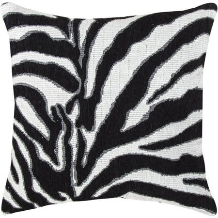 Add a pop of fun pattern to any space in your home with this black and white zebra print pillow. Available in two sizes, this square-shaped pillow brings a touch of exotic style to your home. <br /> <br /> <ul> <li>Set includes: One (1) pillow</li> <li>Pattern: Zebra</li> <li>Removable cover: No</li> <li>Edging: Knife</li> <li>Pillow shape: Square</li> <li>Dimensions: 18 inches high x 18 inches wide x 4.5 deep<br />22 inches high x 22 inches wide x 4.5 inches deep</li> <li>Cover materials: 60-percent acrylic/ 20-percent rayon/ 20-percent cotton</li> <li>Fill materials: Polyester</li> <li>Care instructions: Spot clean</li> </ul> <br /> <i>The digital images we display have the most accurate color possible. However, due to differences in computer monitors, we cannot be responsible for variations in color between the actual product and your screen.</i> <br /> <br /> <br /> <br /> <br />