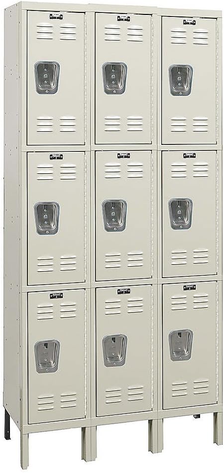 HALLOWELL Galvanite Corrosion-Resistant 3-Tier Lockers are rust-resistant and extremely strong. Completely rust-resistant. Made with Galvanneal sheet steel and finished with a heavy coat of high-grade baked on powder coat. Galvanneal is harder than regular galvanized coating, completely rust-resistant and more resistant to scratches and damage. 16-gauge steel door and frame and 24-gauge steel body. Continuous piano hinge. One-piece stainless steel recessed handle with 2-point lock. Includes 6"H legs. Number plates are included; Specify number at time of order, otherwise will start with #1. Color: putty.