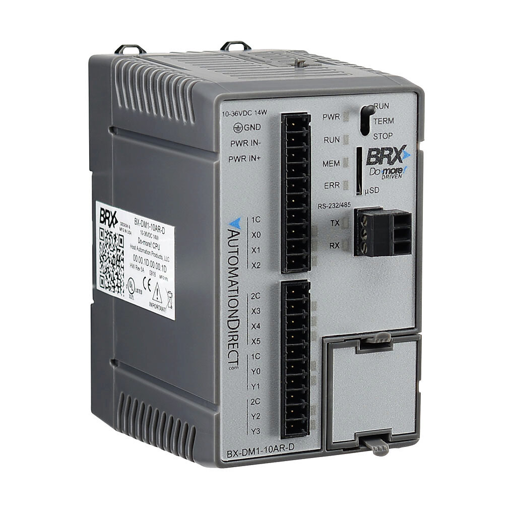 BX-DM1-10AR-D - BRX Do-more PLC, 12-24 VDC required, serial port, microSD card slot, Discrete Input: 6-point, AC, Discrete Output: 4-point, relay.