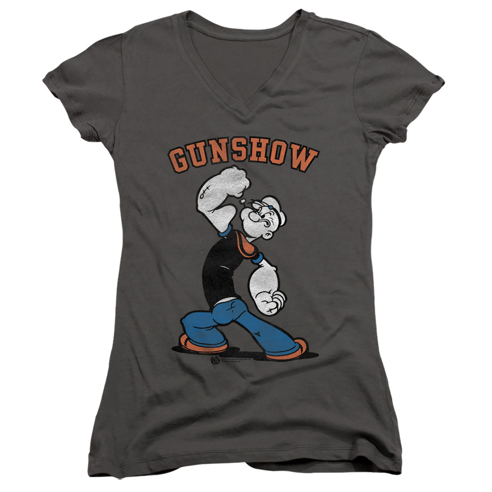 Trevco PYE787-JV-2 Popeye & Gunshow-Junior V-Neck Cap Sleeve T-Shirt, Charcoal - Medium