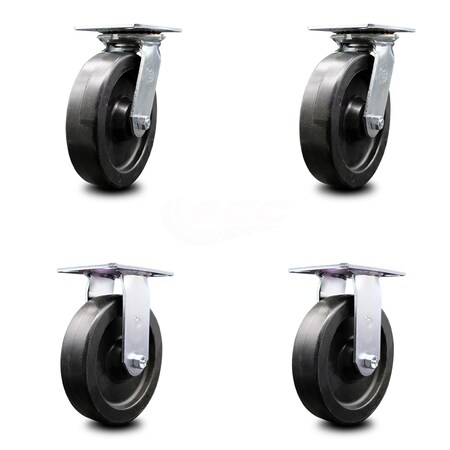 Heavy Duty Large Top Plate Polyolefin Swivel Caster w/Main. Free Bearings Set of 4 w/8" x 2" Black Wheels - Includes 2 Swivel & 2 Rigid - 3600 lbs Total Capacity - Service Caster Brand