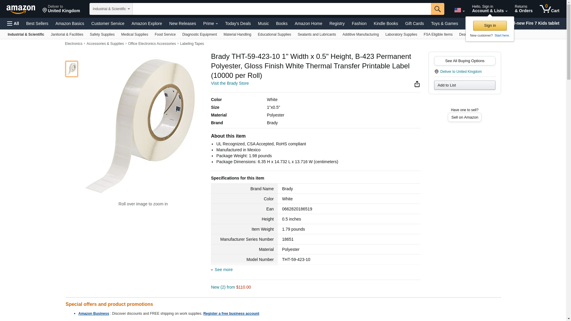 <p><strong>Brady, THT-59-423-10, 18651 0.5" x 1" White WorkHorse Glossy Polyester Label, 3" Core</strong></p><p>Permanent Polyester (B-423) is ideal for electronic PCB and component identification, bar code labels, rating plates and solar panel identification.</p><ul><li>Glossy white finish with permanent acrylic is thermal transfer printable</li><li>RoHS compliant to 2005/618/EC MCV amendment to RoHS Directive 2002/95/EC; UL approved; CSA accepted</li><li>Meets requirements of a halogen-free material per DIN VDE 0472 part 815</li></ul>