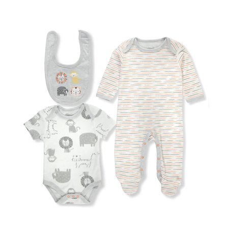 <ul> <li>Rene Rofe 3-piece layette set</li> <li>Footed coverall with striped jersey construction, contrast rib-knit trim, and easy-change snaps (100% cotton)</li> <li>Printed jersey bodysuit with lap collar, contrast rib-knit trim, and easy-change snaps (100% cotton)</li> <li>Jersey bib with printed graphic, contrast trim, and hook-and-loop closure (100% cotton)</li> <li>Machine wash cold, inside out</li> </ul>