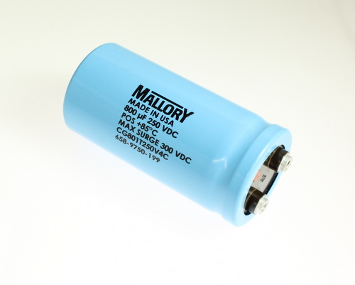 Mallory capacitor: P/N CG801T250V4C; capacitance = 800 uF, voltage = 250 VDC, tolerance = -10%+50%, temperature = 85, lead type = screw, lead style = high post; cg801t250v4c mallory screw terminals capacitor. high post; case size: 2 x 4 1/8; (item ID: 2020071348)