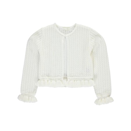<ul> <li>American Princess shrug</li> <li>Cotton-blend loose-knit construction</li> <li>Ruffled rib-knit trim</li> <li>Hook-and-eye closure at neck</li> <li>55% cotton, 45% acrylic</li> </ul>