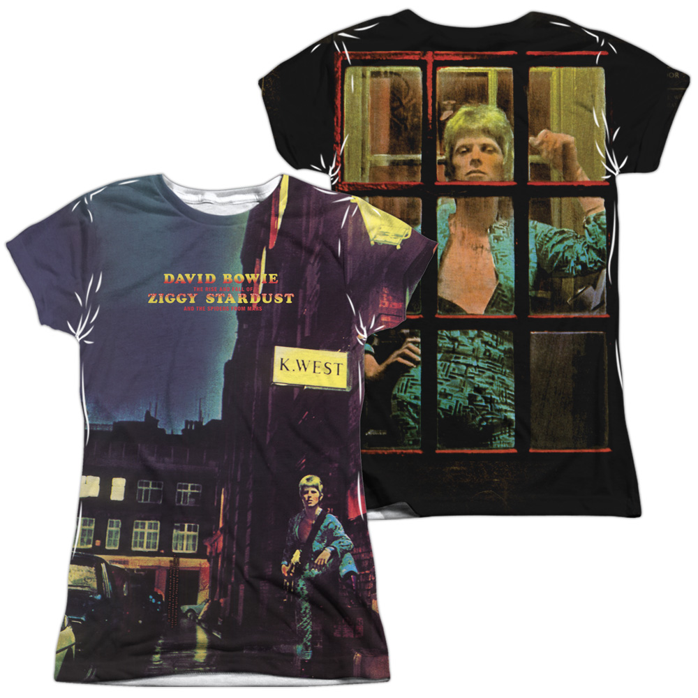 Trevco BOWIE113FB-JSPP-3 David Bowie & Ziggy Star Dust Front & Back Print Junior Cap Sleeve Polyster Crew Neck T-Shirt&#