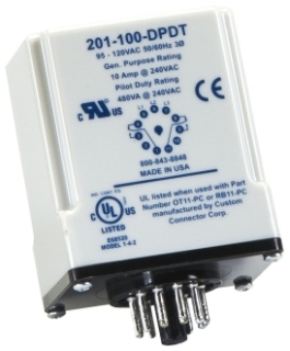 201-100-DPDT - SymCom 3-Phase 11-Pin Plug-In Voltage Monitor 95-120V DPDT The Model 201-xxx-DPDT Family An 11-pin octal base plug-in voltage monitor designed to protect 3-phase motors regardless of size. The 201-100-DPDT is used on 95-120VAC, 50/60Hz motors and the 201-200-DPDT is used on 190-240VAC, 50/60Hz motors to prevent damage caused by incoming voltage problems. The units feature two isolated sets of contacts that are ideal for use with two control circuits with different voltages. The unique microcontroller-based voltage and phase-sensing circuit constantly monitors the voltages to detect harmful power line conditions When a harmful condition is detected, the MotorSaver's output relays are deactivated after a specified trip delay. The output relays reactivate after power line conditions return to an acceptable level and a specified amount of time has elapsed (restart delay). The trip delay prevents nuisance tripping due to rapidly fluctuating power line conditions. This unit is also available with a shorter trip delay and faster restart delay. The 201-xxx-DPDT-60mS has a trip delay of 0.5 seconds and a restart delay of 60 milliseconds. Features : Low voltage protection Single-phase protection Reverse-phase protection Voltage unbalance protection Two isolated Form C relays (DPDT) Diagnostic LED 11-pin plug-in; DIN rail or surface mount Auxiliary Products: 11-pin octal socket P/N: OT11-PC NULL