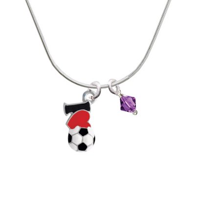 Silver Tone I love Soccer - Red Heart - Purple Bicone Crystal Necklace. Silver Tone Charm. Charm size is approx. 0.74 x 0.42 x 0.1 inches (HxWxD) including loop. 18 Inch Snake Chain Necklace with a Lobster Claw Clasp. Hand wrapped crystal bicone is approx: 6mm. We use Swarovski Crystallized Elements. Available in many colors. We are a family owned company in the U.S.A. since 1977. PLEASE NOTE: Our products are lead safe, but are not intended for children 14 years and younger.
