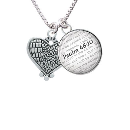 Silver Tone Antiqued Snake Print Heart Bible Verse Psalm 46:10 Glass Dome Necklace. Silver Tone Charm. Charm size is approx. 0.76 x 0.7 x 0.11 inches (HxWxD) including loop. 1.3mm Box Chain Necklace is adjustable from 18 to 20 inches. Necklace comes with lobster claw clasp and 2 inch extender chain. "Be still, and know that I am God: I will be exalted among the heathen, I will be exalted in the earth. Featured necklace is an exclusive Delight & Co. design. We are a family owned company for over 35 years in the U.S.A. PLEASE NOTE: Our products are lead safe, but are not intended for children 14 years and younger.