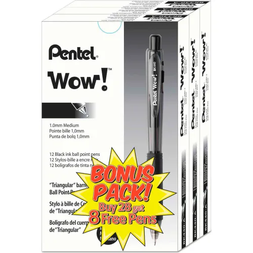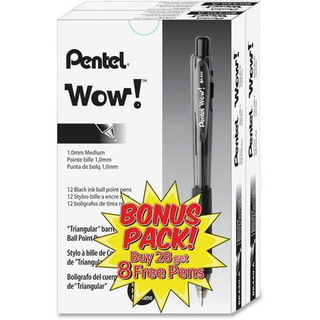 Pentel Wow! Ballpoint Pen Value Pack, Retractable, Medium 1 Mm, Black Ink, Black Barrel, 36/pack