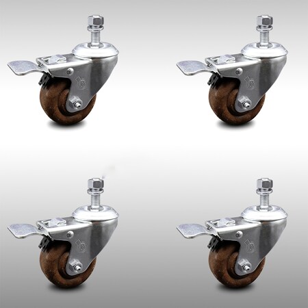 Stainless Steel High Temp Glass Filled Nylon Swivel Threaded Stem Caster Set of 4 w/3" x 1.25" Brown Wheels & 3/8" Stems- Includes 4 with Total Lock Brakes-1400 lbs Total Capacity-Service Caster Brand