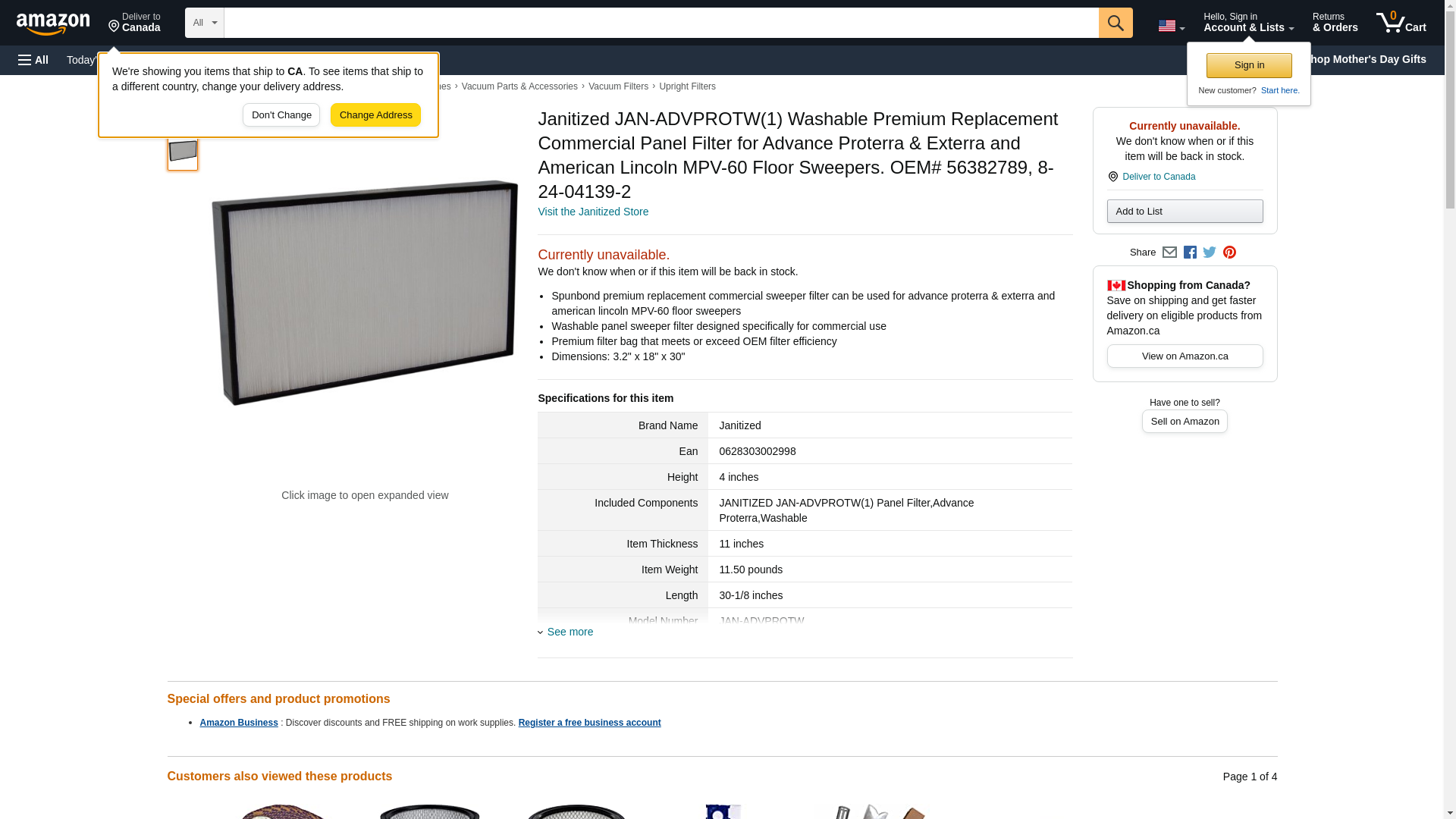Janitized JAN-ADVPROTW(1) Washable Premium Replacement Commercial Panel Filter for Advance Proterra & Exterra and American Lincoln MPV-60 Floor Sweepers. OEM# 56382789, 8-24-04139-2