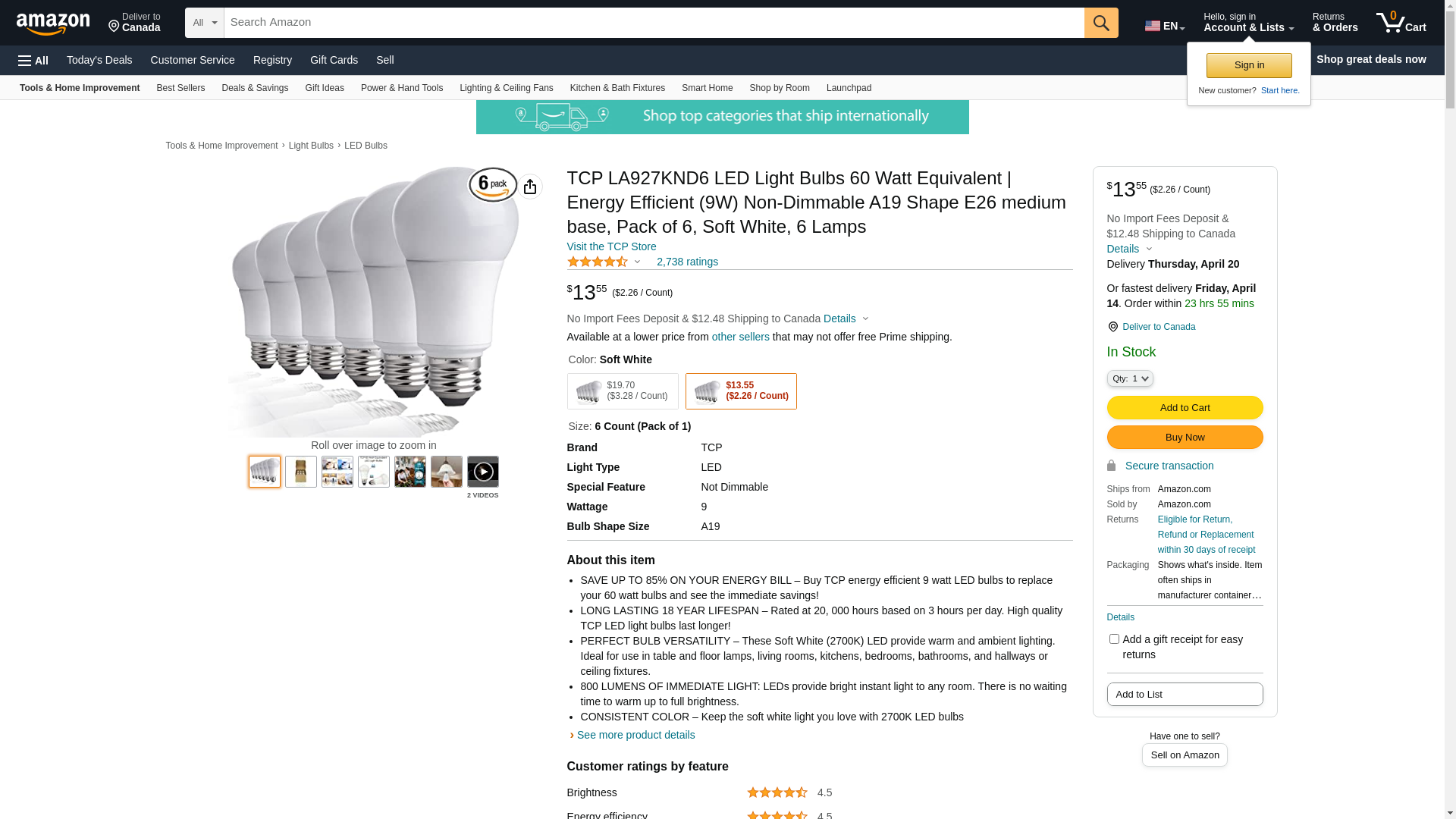| Feature | SAVE UP TO 85% ON YOUR ENERGY BILL - Buy TCP energy efficient 9 watt LED bulbs to replace your 60 watt bulbs and see the immediate savings! |