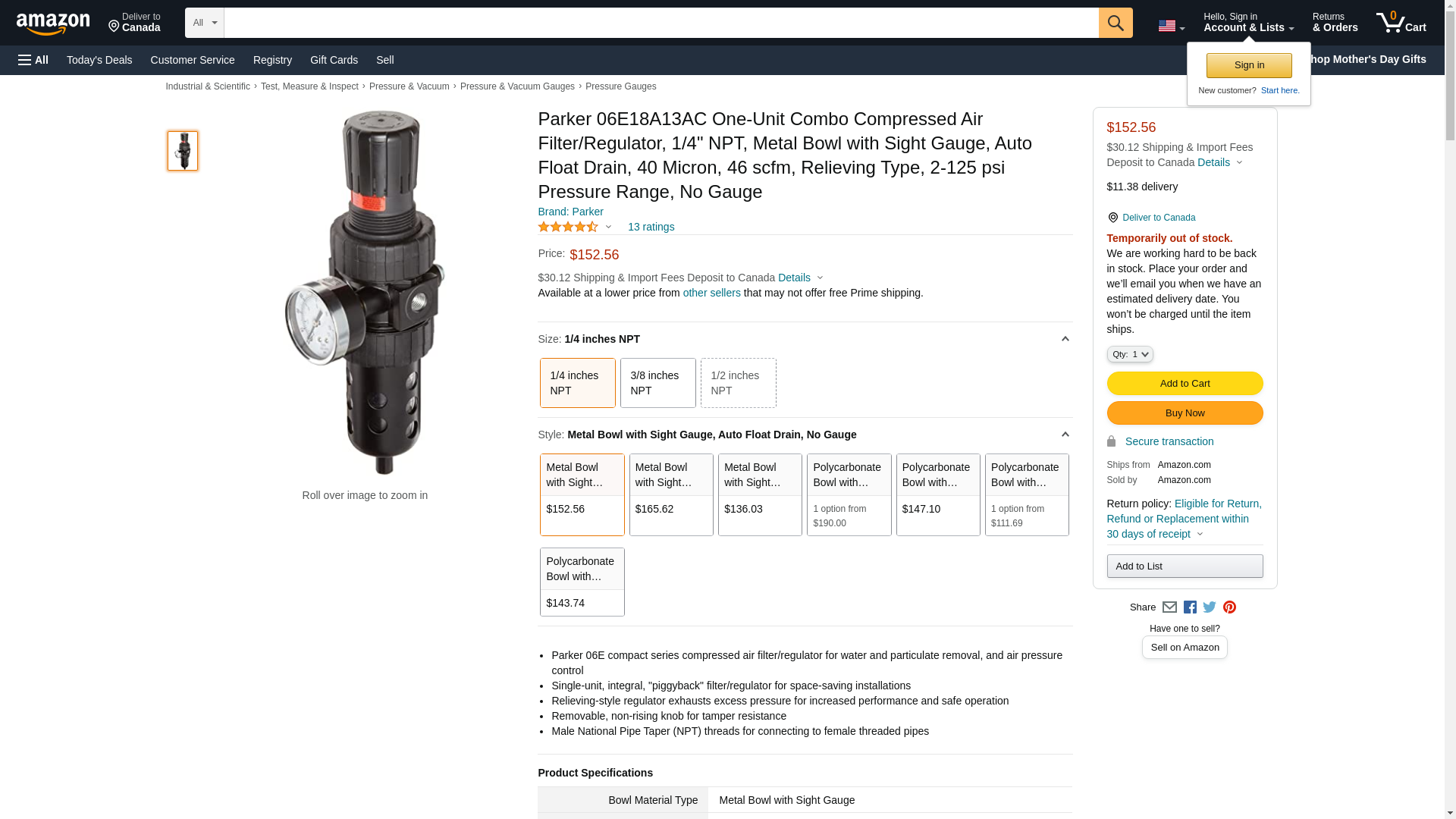 - Parker 06E compact series compressed air filter/regulator for water and particulate removal, and air pressure control