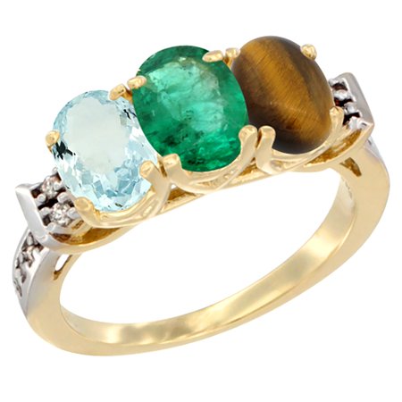 10K Yellow Gold Natural Aquamarine, Emerald & Tiger Eye Ring 3-Stone Oval 7x5 mm Diamond Accent, sizes 5 - 10
