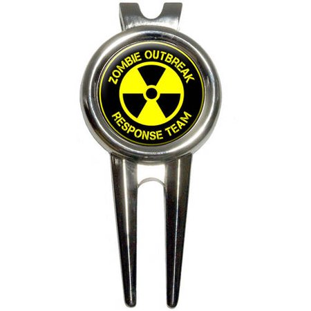<br /> <b>Zombie Outbreak Response Team/Radiation Symbol/Yellow on Black Golf Divot Repair Tool and Ball Marker:</b> <ul> <li>Ergonomic divot tool repairs golf green</li> <li>Made from chrome-plated metal</li> <li>Includes inlaid magnetic ball marker with design as shown</li> <li>Easily and comfortably fits in the palm of hand</li> <li>Tool also has clip on back for attaching to golf bag</li> </ul>