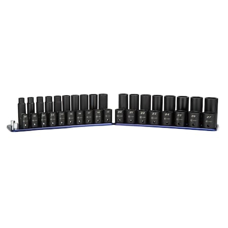 - 36-piece set includes (18) 1/2 in. drive deep impact sockets: 10, 11, 12, 13, 14, 15, 16, 17, 18, 19, 20, 21, 22, 23, 24, 25, 26, 27 mm and (18) shallow impact sockets: 10, 11, 12, 13, 14, 15, 16, 17, 18, 19, 20, 21, 22, 23, 24, 25, 26, 27 mm. Comes with a billet aluminum socket rail made by Westling Machine in the USA
