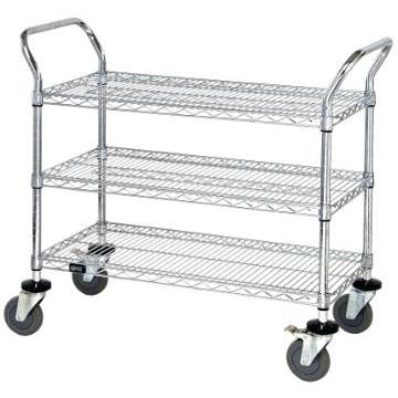 - Three-tier wire utility cart has swivel casters, three shelves, and two ergonomically positioned u-shaped handles; suitable for sorting, storing, and transporting items