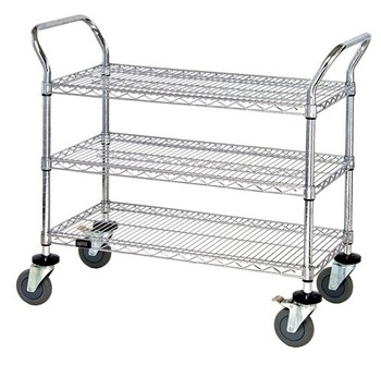 Versatile Wire Utility Cart maneuvers easily in tight spaces to transport everything from patient supplies to linens to inventory. Multi-purpose cart features bright chrome shelves and posts that are maintenance-free and offer quick assembly. Reinforced chrome wire shelves with open design allows quick access to all 4 sides for faster retrieval and restocking. Compact size is easy to handle through corridors and doorways without difficulty. Rolls easily on 5" dia. rubber wheel swivel casters with donut bumpers to help protect walls & fixtures. 800 lbs. capacity. 39"H overall. Intended for dry environment. NSF Approved. 1-Year Warranty. Ships KD, assembles easily. 3-Shelf Wire Utility Cart - 36"W x 24"D 800 lbs. capacity