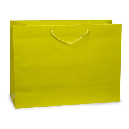 <ul> <li>Lime Gloss Vogue Gift Bags 10 Pk 16x6x12"</li> <li>Deluxe Gloss Color Laminated Paper Totes are made of heavyweight 150 gsm laminated paper, with cardboard bottom inserts, and coordinating cord handles.</li> </ul>