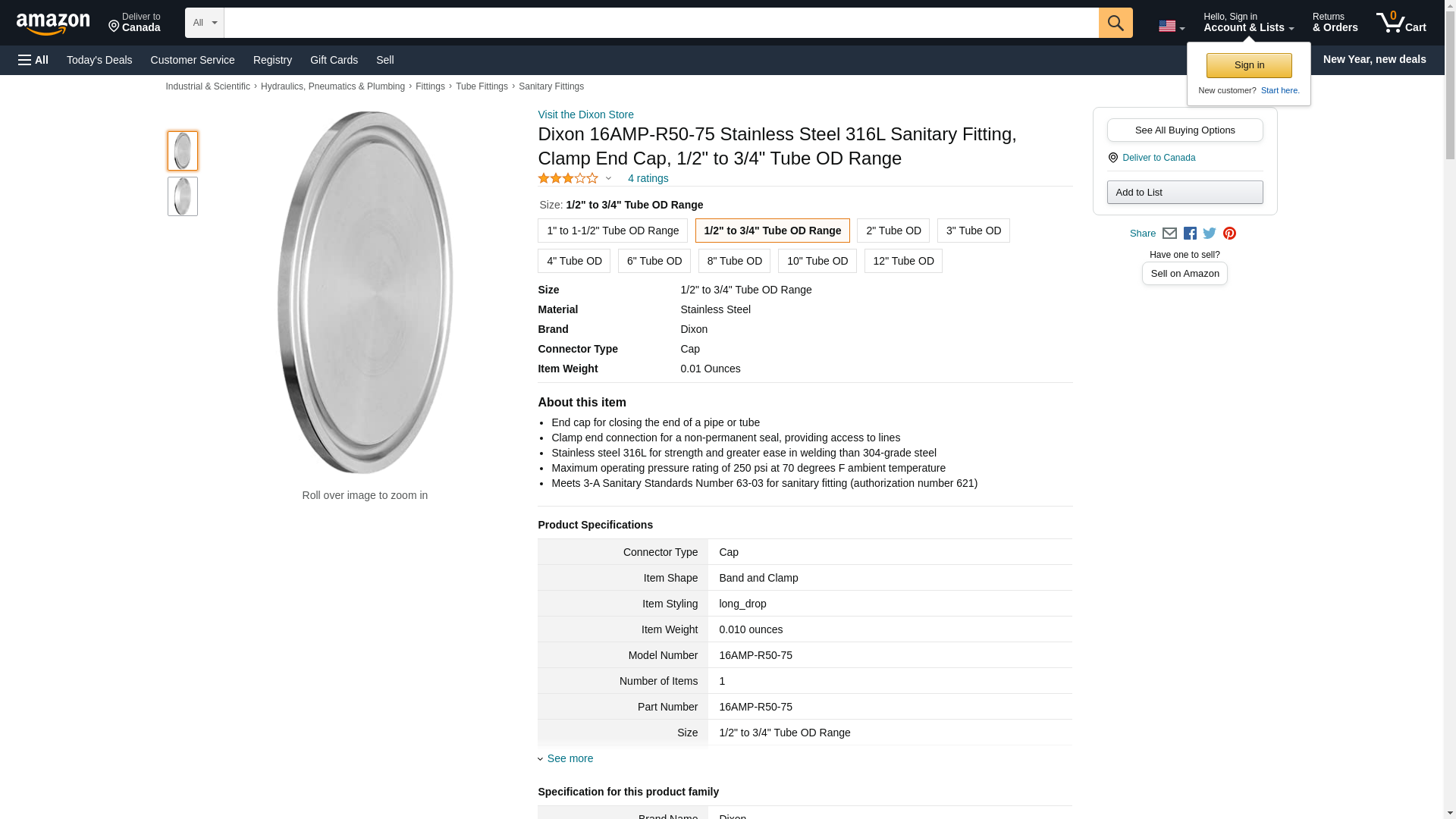 Dixon 16AMP-R50-75 Stainless Steel 316L Sanitary Fitting, Clamp End Cap, 1/2" to 3/4" Tube OD Range