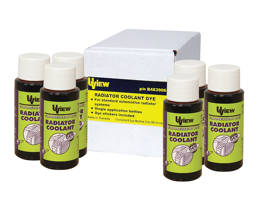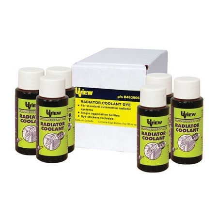 UVB483906 Features: -Specifically designed for standard glycol coolants (green). -Convenient individual application bottles, 6 Bottles (1 oz./30 ml). -Works with most UV lights. -Pinpoint leaks in cooling systems, including Radiator, Hoses, Fittings, Water Pumps and Head GasketsUView Ultraviolet Systems Inc. is the worldwide leader in the automotive aftermarket, since we first started tracking leaks in automotive air conditioning systems in 1996. Today, UView is globally recognized for quality and innovations. This is designed to detect leaks in cooling systems that use standard glycol based coolant (green). Be the first customer to share their experience with this item.. Product Type: -Guards. Dimensions: Overall Height - Top to Bottom: -2.5 Inches. Overall Width - Side to Side: -3 Inches. Overall Depth - Front to Back: -4.25 Inches. Overall Product Weight: -0.6 Pounds.