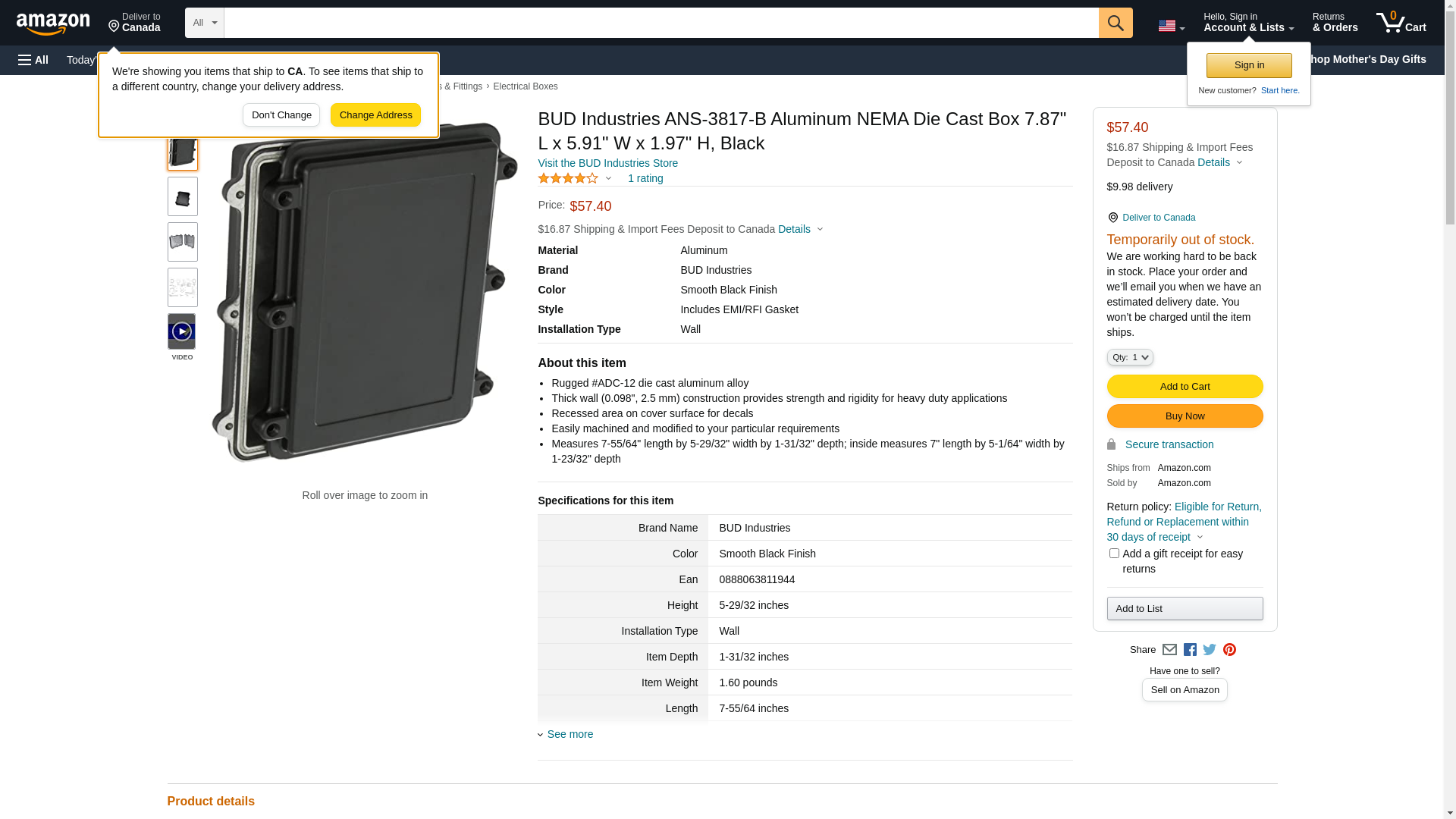 BUD Industries ANS-3817-B Aluminum NEMA Die Cast Box 7.87" L x 5.91" W x 1.97" H, Black