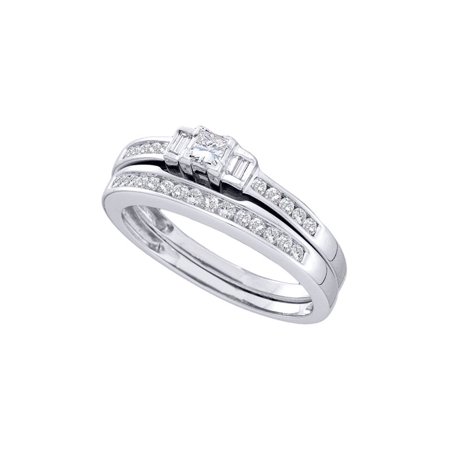 <ul> <li>10kt White Gold</li> <li>3/8 Carats total weight --- 1/8 carat center solitaire</li> <li>Widest point width: 3.5 mm (.14 inches )<br />; Width of shank: 2 mm</li> <li>3.49 grams (approximately)</li> <li>Ring size selectable. All diamonds are natural and conflict-free in origin.</li> </ul>