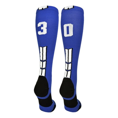 <p><strong>Product Features</strong></p> <ul> <li>SELECT YOUR OWN CUSTOM JERSEY NUMBER: Sold by the pair. Select your own jersey number. These socks are perfect for basketball, soccer, softball, baseball, field hockey, volleyball, football, lacrosse and make great team socks!</li> <li>ACCURATE SIZING: Shoe Size: Small Youth 12-5 or Womens 4-7, Medium - Womens 7-10 or Mens 6-9, Large - Womens 10-13 or Mens 9-12, X-Large Womens 13+ or Mens 12+</li> <li>PERFORMANCE MATERIALS: Fiber Contents: 77% Polypropylene, 17% Nylon, 3% Elastic, 3%Lycra Spandex</li> <li>PERFORMANCE FEATURES: Moisture Wicking, Arch and Ankle Compression to reduce fatigue, Blister Control, Lightweight, Double Welt Top, Heel/Toe Design, Infused Alphasan Antimicrobials control bacteria and odor</li> <li>QUALITY CONSTRUCTION: Made with love in the USA</li> </ul> <p><strong>Product Description</strong></p> <p>SOLD AS A PAIR!! Royal/White Player Id Custom Over The Calf Number Socks (Pair). Select your own custom jersey number. High performance athletic socks for all team sports and elite athletes. Shoe Size: Small - Youth 12-5 Womens 4-7, Medium - Womens 7-10 Mens 6-9, Large - Womens 10-13 Mens 9-12, X-Large Womens 13+ Mens 12+.</p> <p></p>