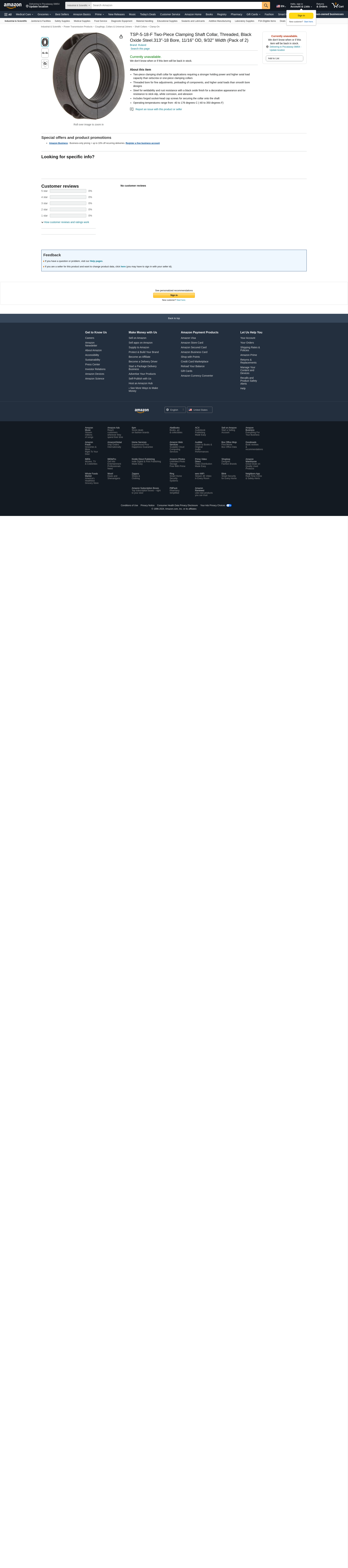 Shaft Collar, System of Measurement Inch, Shaft Locking Type - Couplings 2 Piece Clamp, Bore Type - Collars Threaded Bore, Bore Dia. 5/16 In.-18, Material - Collars Black Oxide 1215 Lead Free Steel, Outside Dia. 11/16 In., Width 9/32 In., Clearance Dia. 0.815 In., Screw Size #4-40, Screw Material Alloy Steel, Operating Temp. Range -40 Degrees to 350 Degrees F