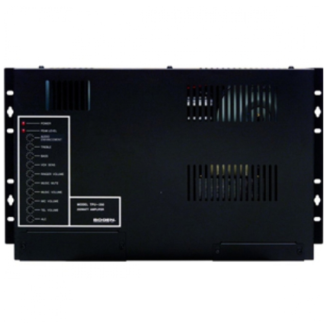 - Bogen 250 watt wall-mounted telephone paging amplifier<br/>- Inputs for 600-ohm balanced telephone line Lo-Z balanced microphone and background music<br/>- Music input (RCA jack or screw terminals)<br/>- Integral automatic level control (ALC) circuit for controlling pages made by persons with varying voice levels and paging techniques<br/>- Page from telephone and/or microphone<br/>- Signal-activated paging channel automatically mutes background music<br/>- Adjustable background music muting level during a page<br/>- Music gradually returns to its normal level after a page<br/>- Audio Enhancement circuit increases intelligibility improves perceived loudness (with no increase in power) and reduces listener fatigue<br/>- Separate controls for page volume music volume night ringer music mute and Audio Enhancement<br/>- Bass and treble controls<br/>- Built-in night ringer activated by contact closure or by 90V ring signal<br/>- 25V and 70V outputs are available on the TPU250<br/>- VOX sensitivity level control eliminates accidental transmission of background noise from a paging telephone<br/>- Thermal and electronic overload protection<br/>- Jacks provided for bridging additional TPU amplifiers<br/>- Brackets are attached to each model for easy wall mounting; the TPU250 can also be rack-mounted with included brackets; TPU-B models can be rackmounted with RPK82 mounting kit (sold separately)<br/>- Peak level indicator lights when amplifier is driven into clipping<br/>- 120V AC 60 Hz power source<br/>- Listed to UL Standard 60065 for U.S. & Canada