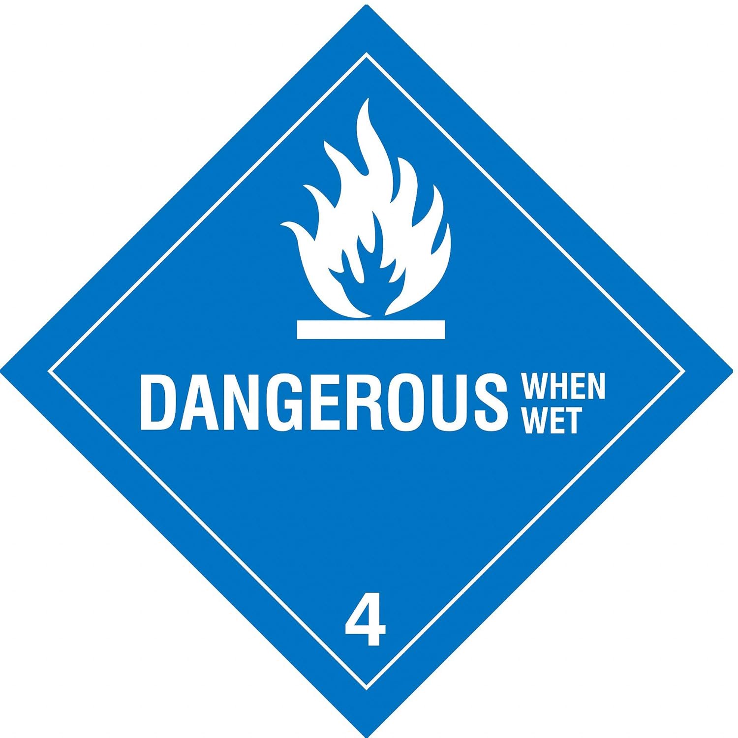 'DOT Label, Class 4, Legend Dangerous When Wet, Legend/Background Color White/Blue, Material Vinyl, Self-Sticking, Height 4 In., Width 4 In., Package Quantity 25'