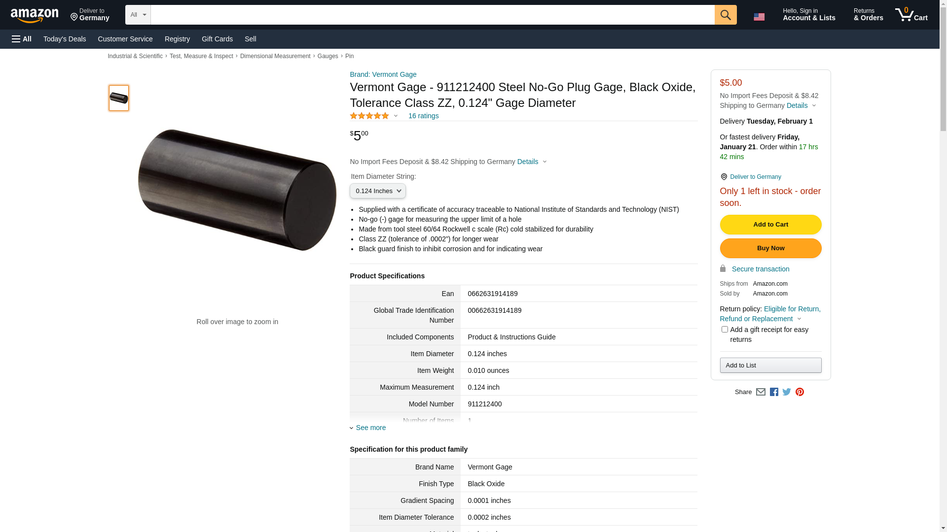 Order 911212400 by Vermont Gage .124" Minus Class ZZ Pin Gage Black Guard NIST - US Mega Store