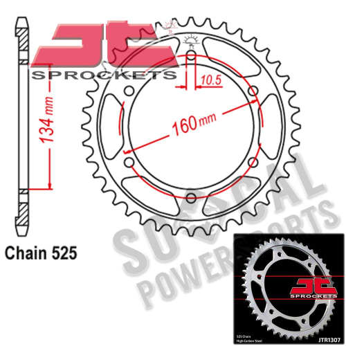 JT Sprockets Steel Rear Sprocket<br/>Contains: One Steel Sprocket<br/>Location: Rear<br/>Size: 42 Tooth<br/>Type: 525 Pitch<br/><br>* Actual Contents May Vary from Photo<br/><br>* Verify Coutershaft / Rear Hub Measurements Prior To Ordering, Due To Same Year Model Variances<br/><br/><br>     Vehicle fitment is based soley on Countershaft/Hub fit.<br/><br>     Before ordering verify crankcase, swing-arm or pertaining chain clearance<br/><br>     Nuts, Bolts, and locks are not included<br><br><br>-Computer-designed to achieve ultimate strength at minimum weight<br>-JT combines leading-edge technology with top materials to produce the ultimate quality sprocket range with unbeatable value<br>-Every sprocket meets or exceeds the highest possible quality standards set for the motorcycle industry<br>-Sprockets are heat-treated and bead-blasted to reduce material surface tension<br>-Front sprockets made with C45 steel and SCM415 chromoly steel alloy; rear sprockets made with top-quality-grade C45 high-carbon steel