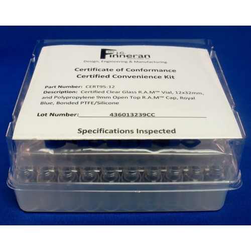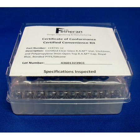 <p><strong>J.G. Finneran Associates, MSC95E-12A, Mass Spec Certified Amber glasss 9mm R.A.M. Vial w/Grad SpOpen Top, 12 x 32mm, w/PP Open Top Cap, Royal Blue, Bonded PTFE/Silicone</strong></p><p><strong>Features:</strong></p><ul><li>glasss Type 1, Class A, 51A Amber Borosilicate</li><li>Dimensions Height, Diameter, Bottom Thickness, Neck Length, Th read Profile, Annealing</li><li>Cap/Septum Diameter, Height, Th read Integrity, Center Flash, Septa Insertion</li><li>GC/MS Background Test</li><li>LC/MS Background Test</li><li>Particle Counts Particle Size, Particle/mL/Vial</li></ul>