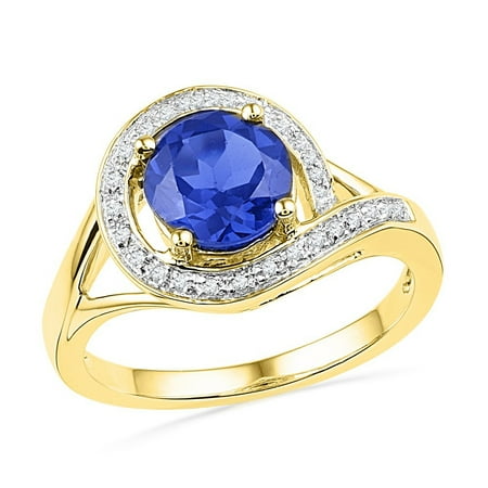 <p><span style="font-size:16px;"><b><u>Description</u></b><br /></span></p> <p><span style="font-size: 14px;">10kt Yellow Gold Womens Round Lab-Created Blue Sapphire Solitaire Diamond Ring 1-7/8 Cttw</span></p> <br /> <p><span style="font-size:16px"><u><b>Gemstone Details</b></u></span></p> <p><span style="font-size:14px">1 & 7/8 Carats total weight --- 1 & 3/4 carat center solitaire<br /><br /><br /><br /></span></p> <ul type="square"> <b>Round Center Lab Blue Sapphire</b> <br /> <li>1 & 3/4 ct.t.w.</li> <li>Flawless clarity</li> <li>Blue color</li> <li>4-prong setting</li> </ul> <br /> <ul> <b>Round Diamond</b> <br /> <li>1/20 ct.t.w.</li> <li>I2-I3 clarity</li> <li>J-K color</li> <li>Pave setting</li> </ul> <br /> <p><span style="font-size:16px"><u><b>Specifications</b></u><br /></span></p> <p><span style="font-size:14px">10kt Yellow Gold<br />4.49 grams (approximately)<br />Ring size selectable</span></p> <p><span style="font-size:11px">Combined gemstone weight of 1 & 7/8 carats total weight represents a range of 1.83 - 1.94 cts. t.w.</span></p>