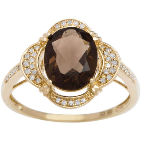 Enhance any wardrobe with this beautiful smoky quartz and diamond ring, showcasing a genuine 10x8mm oval smoky quartz with a halo of round white diamonds. Crafted of shimmering 10-karat white, yellow or rose gold, this piece is a wonderful addition to your jewelry collection. <br /> <br /> <ul> <li>Gemstone colors: Smoky quartz </li> <li>Gemstone shapes: Oval</li> <li>One prong-set smoky quartz measures 10x8mm</li> <li>Gemstone weight: 3 carat</li> <li>Diamonds: 44</li> <li>Diamond cut: Round </li> <li>Diamond weight: 1/3 carats</li> <li>Color: G-H </li> <li>Clarity: I1-I2 </li> <li>Setting: Pave </li> <li>Metal: 10k white, yellow or rose gold</li> <li>Finish: High polish </li> <li>Ring setting dimensions: 18mm wide x 13 mm long x 4mm high</li> <li>Band dimensions: 2 mm wide</li> </ul> <br /> <b>Diamond total weight: 1/3* carat TW</b> <br /> <br /> <b><i>All weights and measurements are approximate and may vary slightly from the listed information. *T.W. (total weight) is approximate. 1/3 carat T.W. may be 0.28 to 0.36 carats. Treatment code E (gemstones), N (diamond). See <a href="http://www.overstock.com/2200/static.html" target="_blank"><span class="links">Treatment Guide</span></a> for further information.</i></b> <br /> <br /> <a href="http://www.overstock.com/downloads/pdf/2010_RingSizing.pdf"><span class="links">Click here for ring sizing guide</span></a> <br /> <br /> <ul> <li>Jewelry Type: Fine</li> <li>Stone Shape: Oval</li> <li>Band Width: 1-2 mm</li> <li>Stone: Gemstone</li> <li>Diamond Color: White</li> <li>Side Stone: Diamond</li> <li>Gold Karat: 10k</li> <li>Total Diamond Weight: Up to .5 Carats</li> <li>Diamond Cut: Round</li> <li>Gender: Female</li> <li>Jewelry Setting: Pave</li> <li>Ring Style: Solitaire, Cocktail-Cluster, Engagement, Pave, Vintage</li> <li>Jewelry Finish: High Polish</li> <li>Gemstone: Quartz</li> <li>Metal Color: White, Yellow, Rose</li> <li>Metal: Gold</li> <li>Gemstone Color: Brown</li> <li>Size: 8.5, 5.5, 7, 6, 5, 6.5, 7.5, 8</li> </ul> <br /> <br />